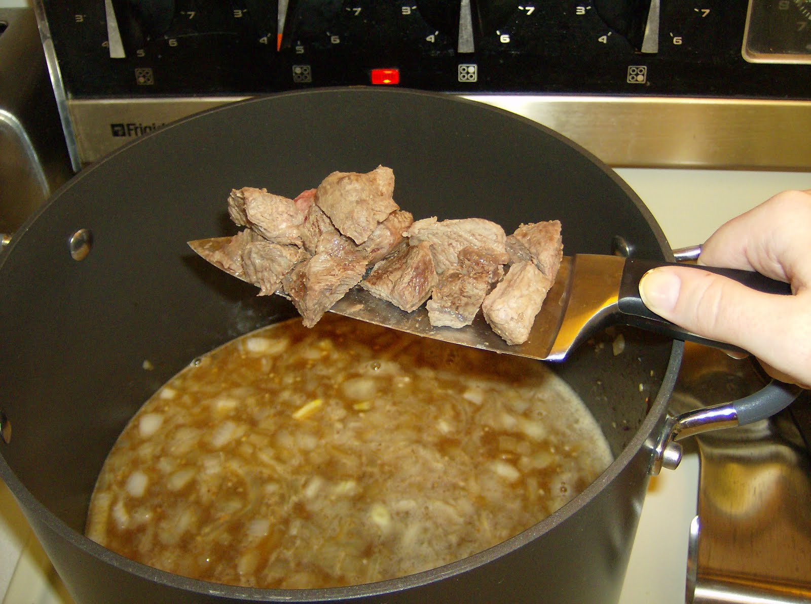 After all of the meat is back into the pot, cover and simmer over low heat. Take about a 2 hour time out. Put your feet up, drink a little of the Guinness if you want. Relax. Your meat needs time to tenderize.